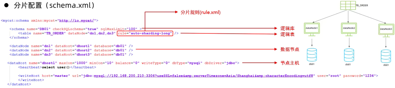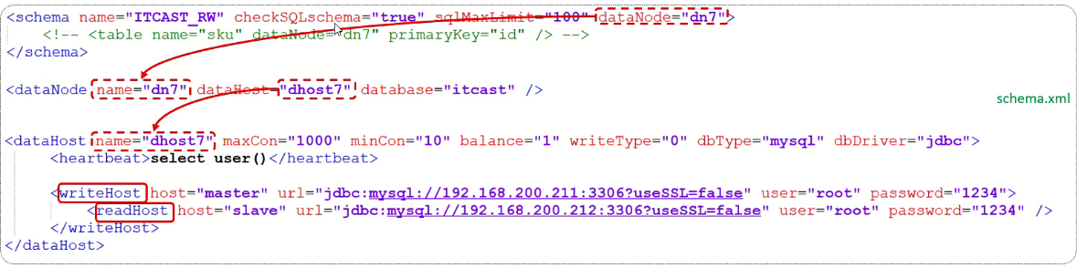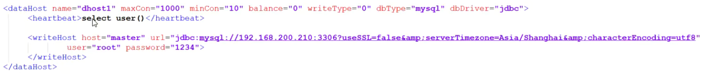 该标签在mycat逻辑库中作为底层标签存在,直接定义了具体的数据库实例、读写分离、心跳语句。