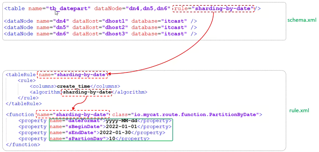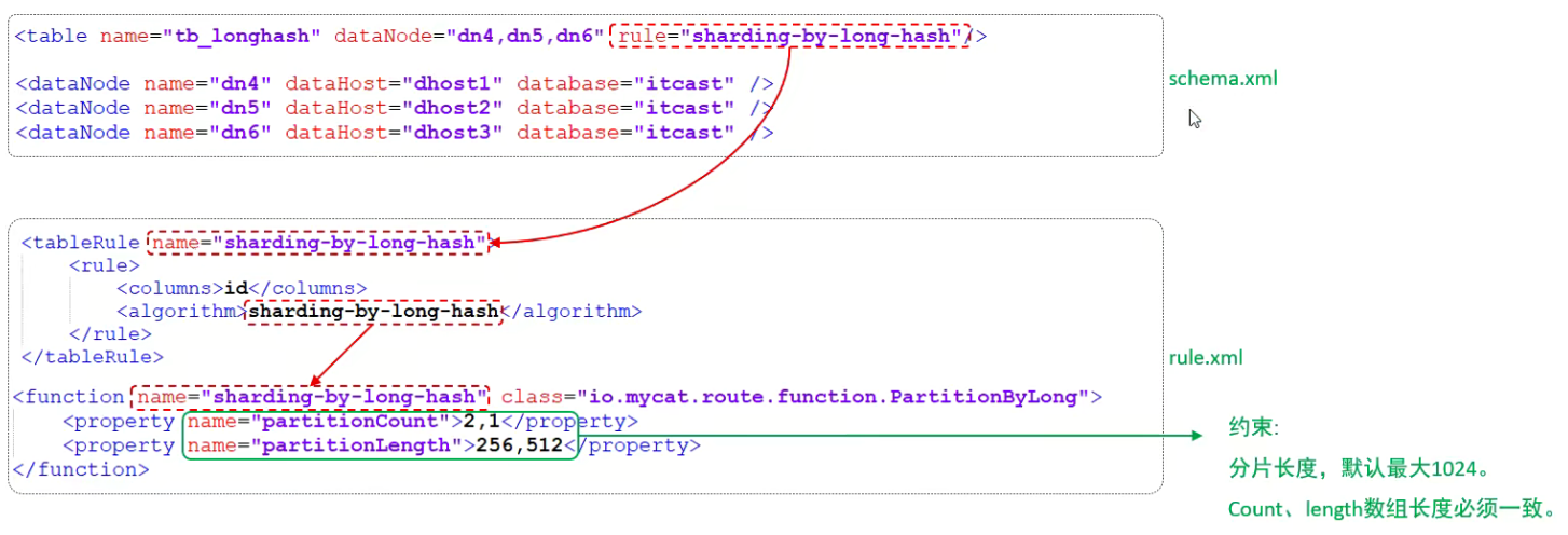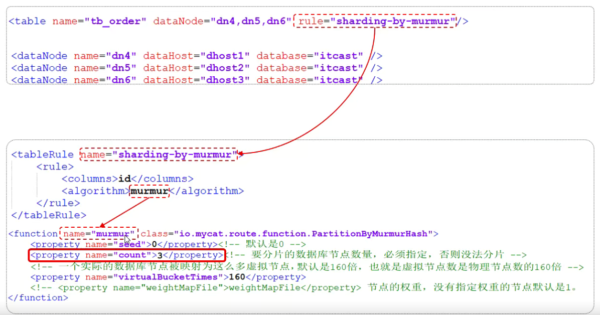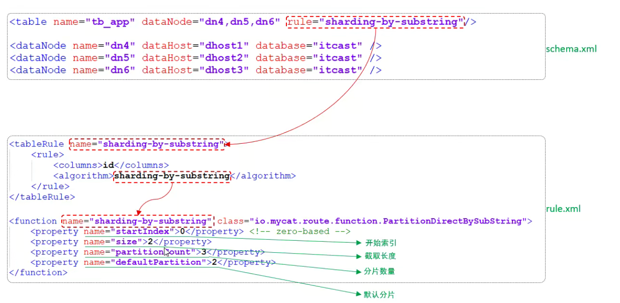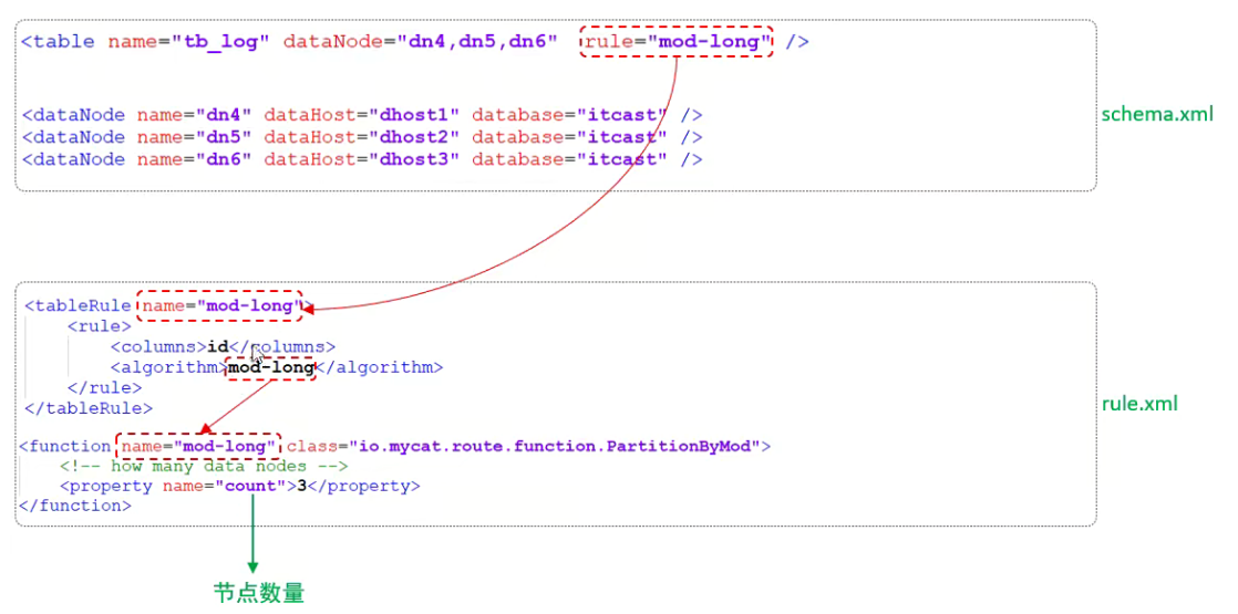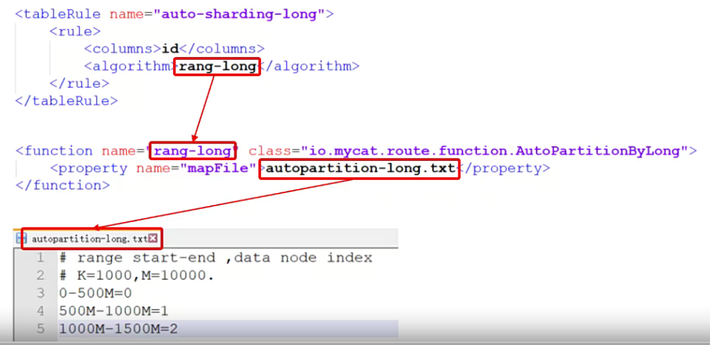 rule.xml中定义所有拆分表的规则,在使用过程中可以灵活的使用分片算法,或者对同一个分片算法使用不用参数,它让分片过程可配置换。主要包含两类标签:tableRule、Function