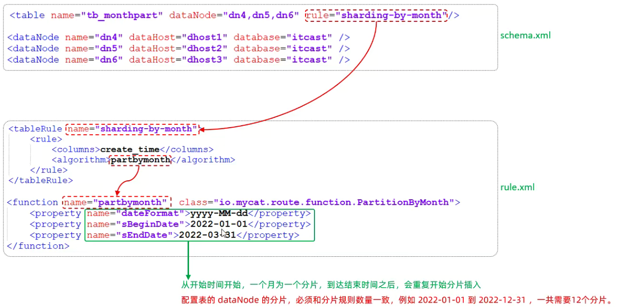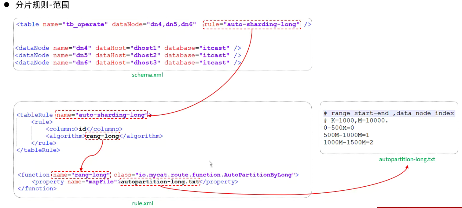 根据指定字段的范围进行分片和节点对应情况来分片