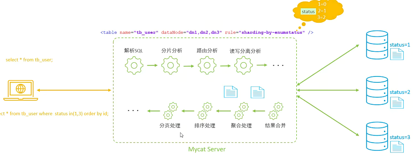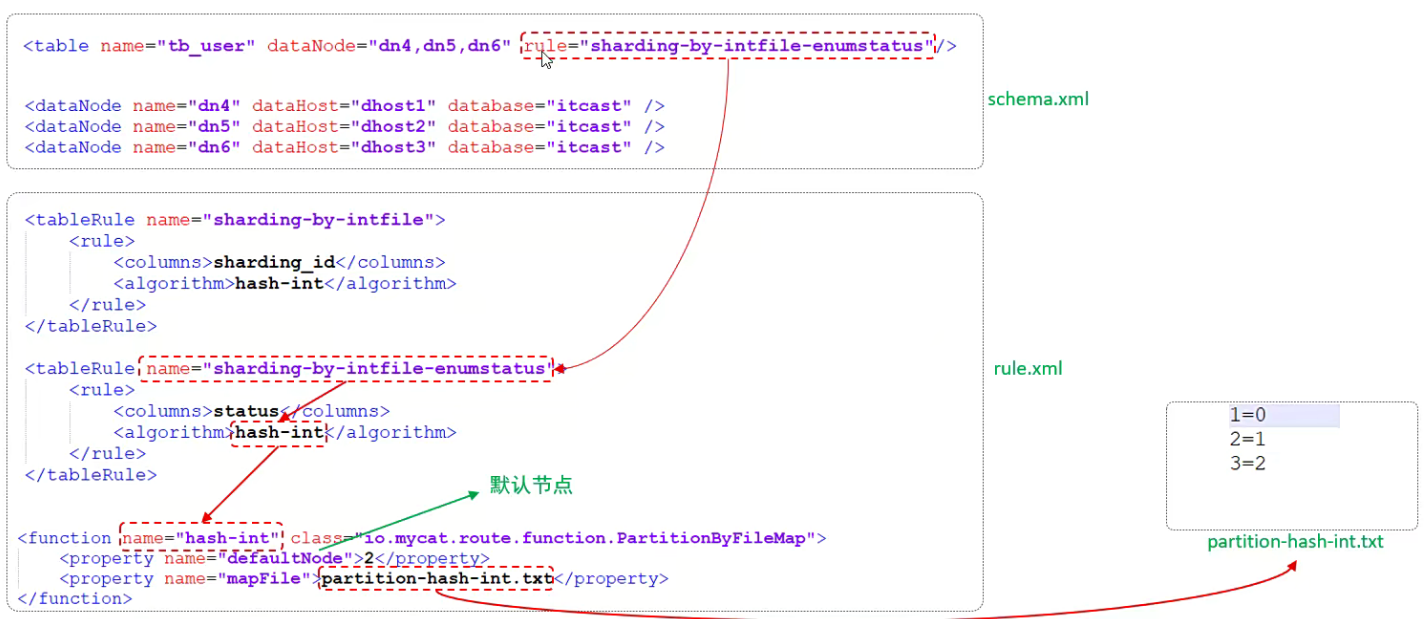 通过在配置文件中配置可能的枚举值,指定数据分布到不同数据节点上,本规则适用于按照省份、性别、状态拆分数据等业务